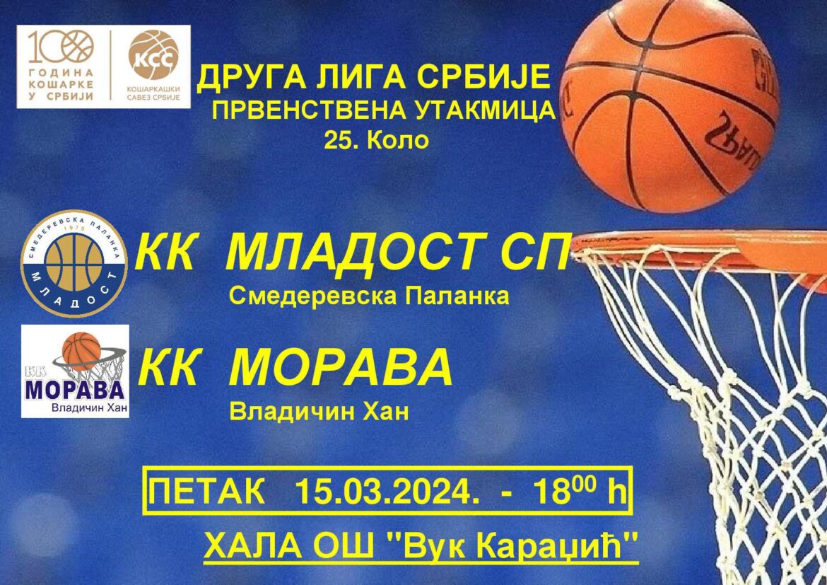 Naime, utakmica 25. kola Druge muške lige Srbije između Mladosti SP i Morave iz Vladičinog Hana zakazana je za petak, 15. mart. Igra se u hali OŠ Vuk Karadžić, a početak je predviđen za 18 sati.
